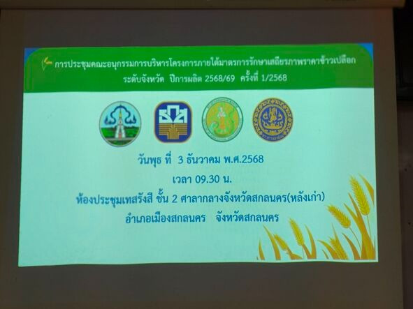 วันที่ 3 ธันวาคม 2568 เวลา 10:00 น. นางสาววัชรี ปุกหุต สหกรณ์จังหวัดสกลนคร มอบหมายให้กลุ่มส่งเสริมและพัฒนาธุรกิจสหกรณ์จัดประชุมคณะอนุกรรมการบริหารโครงการภายใต้มาตรการรักษาเสถียรภาพราคาข้าวเปลือกระดับจังหวัดปีการผลิต 2568 /69 ครั้งที่ 1/2568 ณ ห้องประชุมเทสรังสี ชั้น 2 ศาลากลางจังหวัดสกลนครหลังเก่า อำเภอเมืองสกลนคร จังหวัดสกลนคร โดยมีนายวีรรัตน์ ธีรมิตร รองผู้ว่าราชการจังหวัดสกลนคร เป็นประธานการประชุม เพื่อพิจารณา สหกรณ์การเกษตรเพื่อการตลาดลูกค้า ธ.ก.สสกลนคร จำกัดขอกู้เงินจากธนาคารเพื่อการเกษตรและสหกรณ์การเกษตรตามโครงการสินเชื่อชะลอการขายข้าวเปลือกนาปีปีการผลิต 2568 /69 โดยเช่ายุ้งฉางสถานที่ใช้เก็บรักษาข้าวเปลือก