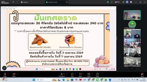 วันนี้ 30 มี.ค.69 นางสาววัชรี ปุกหุต สหกรณ์จังหวัดสกลนคร มอบหมายให้ นางสาววิลาสินี วังทะพันธ์ ผู้อำนวยการกลุ่มส่งเสริมและพัฒนาธุรกิจสหกรณ์ พร้อมบุคลากรกลุ่มส่งเสริมและพัฒนาธุรกิจสหกรณ์ ร่วมประชุมหารือมาตรการช่วยเหลือเกษตรกรผู้ปลูกมันเทศ จังหวัดตราด ผ่านระบบ ZOOM MEETING เพื่อช่วยเหลือเกษตรกร โดยบรรจุกระสอบละ 30 กก. (ชนิดไม่ล้าง) ราคา กระสอบละ240 บาท (เฉลี่ยกก.ละ 8 บาท) โดยมีนายณัฐพล แป้นนอก ผู้ตรวจราชการกรม เขตตรวจราชการที่ 9 , 11 และ 13 นายศุภธีร์ อยู่วัฒนา ผู้ตรวจราชการกรม เขตตรวจราชการที่ 8 และ 18 เป็นประธานการประชุม เป้าหมาย คือ สำนักงานสหกรณ์จังหวัด เขตตรวจราชการที่ 8,9,11, 13 ,18 พร้อมชี้แจงการประกวด 5 กิจกรรม ดังนี้ 1.ประกวดผลการขับเคลื่อนเศรษฐกิจพอเพียงฯ 2. โครงการเสริมสร้างสมดุลชีวิต คนทำงานประจำปี 2569 3. ประกวด CPD DRIVE และ CPD SANDBOX ประจำปีงบประมาณ พ.ศ. 2569 4.การคัดเลือกนักส่งเสริมสหกรณ์ดีเด่น พนักงานราชการดีเด่น และผู้ตรวจการสหกรณ์ดีเด่น ประจำปี พ.ศ. 2569 5.การเตรียมความพร้อมขับเคลื่อน CDC Plus